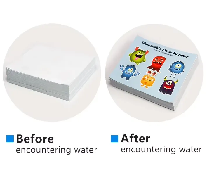 Nuair a thumtar é in uisce, casann sé láithreach i stát atá cosúil le greamaigh agus scaipeann sé go tapa. Scaipeann agus dífhoirmíonn na dathanna a phriontáiltear air dá réir. Tá an próiseas a athraíonn dath do-aisiompaithe. Nuair a bheidh sé faoi lé uisce, taispeánfaidh sé an dath go buan.