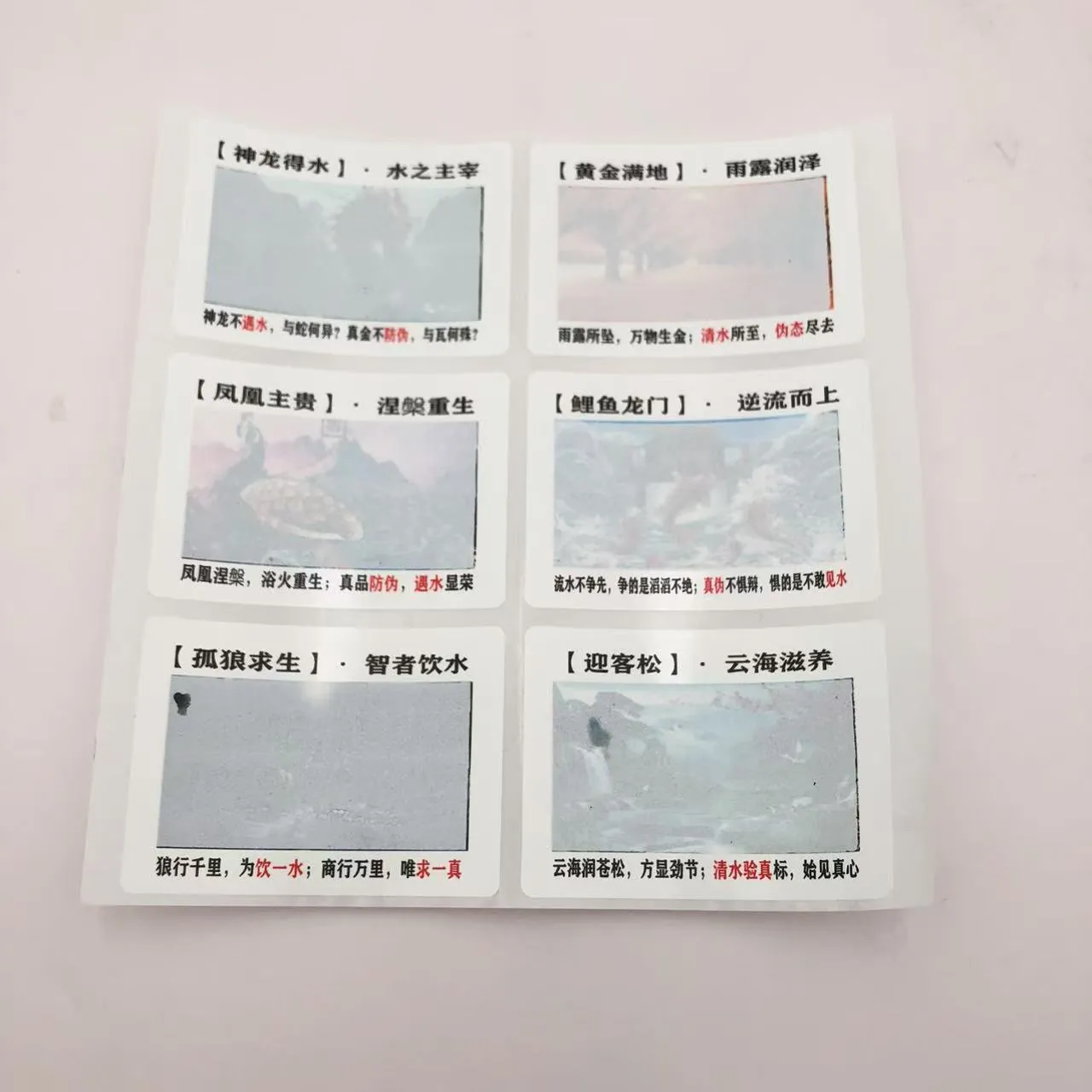 Úsáideann lipéid íogaire uisce d’athrú datha imoibrithe fisiceacha nó ceimiceacha idir an dúch agus an t-uisce chun patrúin fholaithe a dhéanamh infheicthe nó chun athruithe datha a spreagadh. Léirithe le próisis agus trealamh speisialaithe, cuireann na lipéid seo gnéithe frith-ghóchumtha den scoth ar fáil. Tar éis a thriomú, is féidir le cineálacha áirithe filleadh ar a staid tosaigh, rud a chumasaíonn úsáid arís agus arís eile.