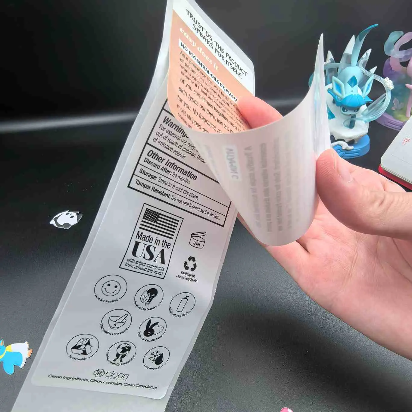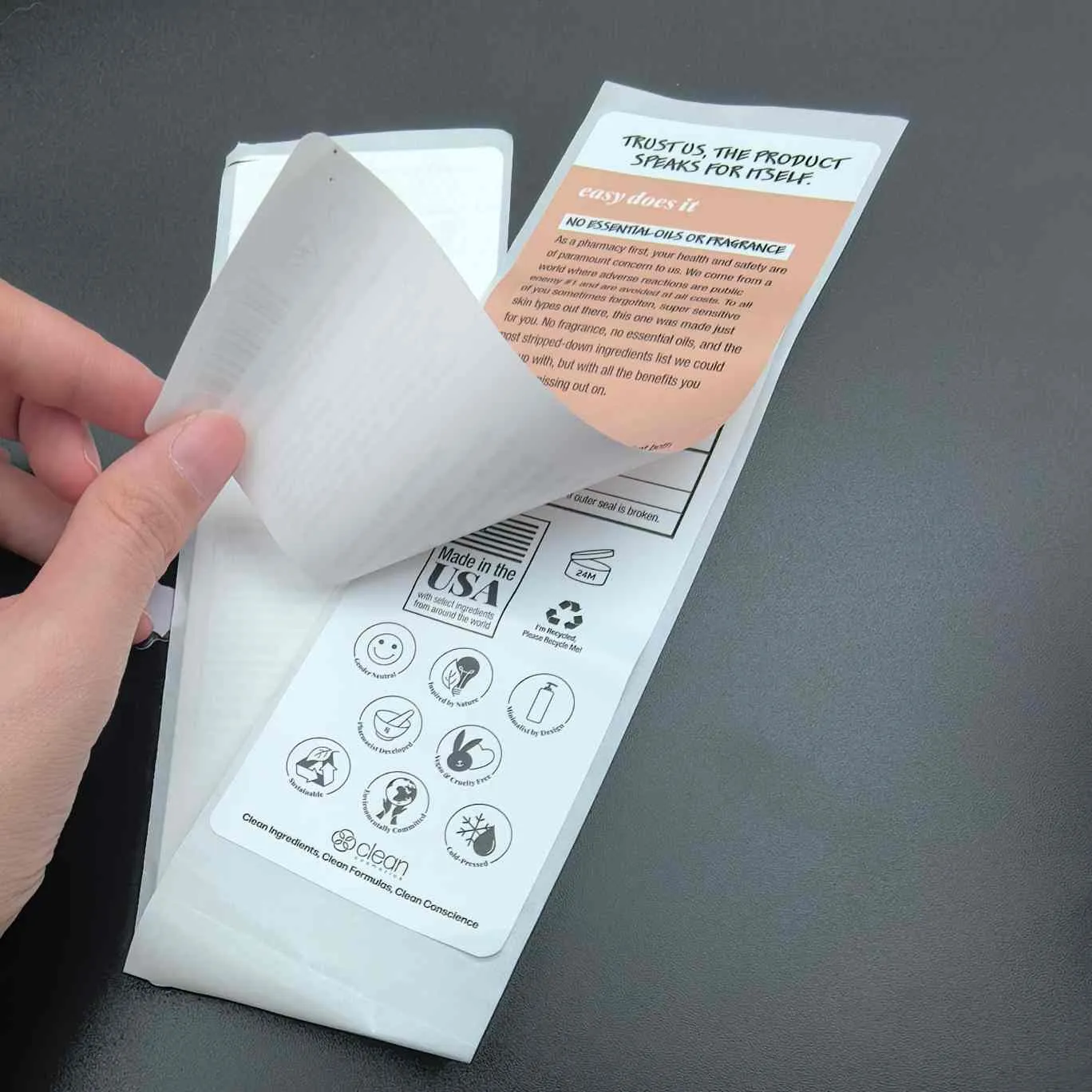 Peel agus léigh lipéid:An cineál is bunúsaí, Tugtar multiLayer air freisin le haghaidh lipéid chosmaideacha Tá an ciseal uachtarach éasca le craiceann amach, agus tá faisnéis leathnaithe sa chiseal istigh. Is minic a úsáidtear é le haghaidh maisc aghaidhe, séirim, agus táirgí pacáistithe beaga eile.