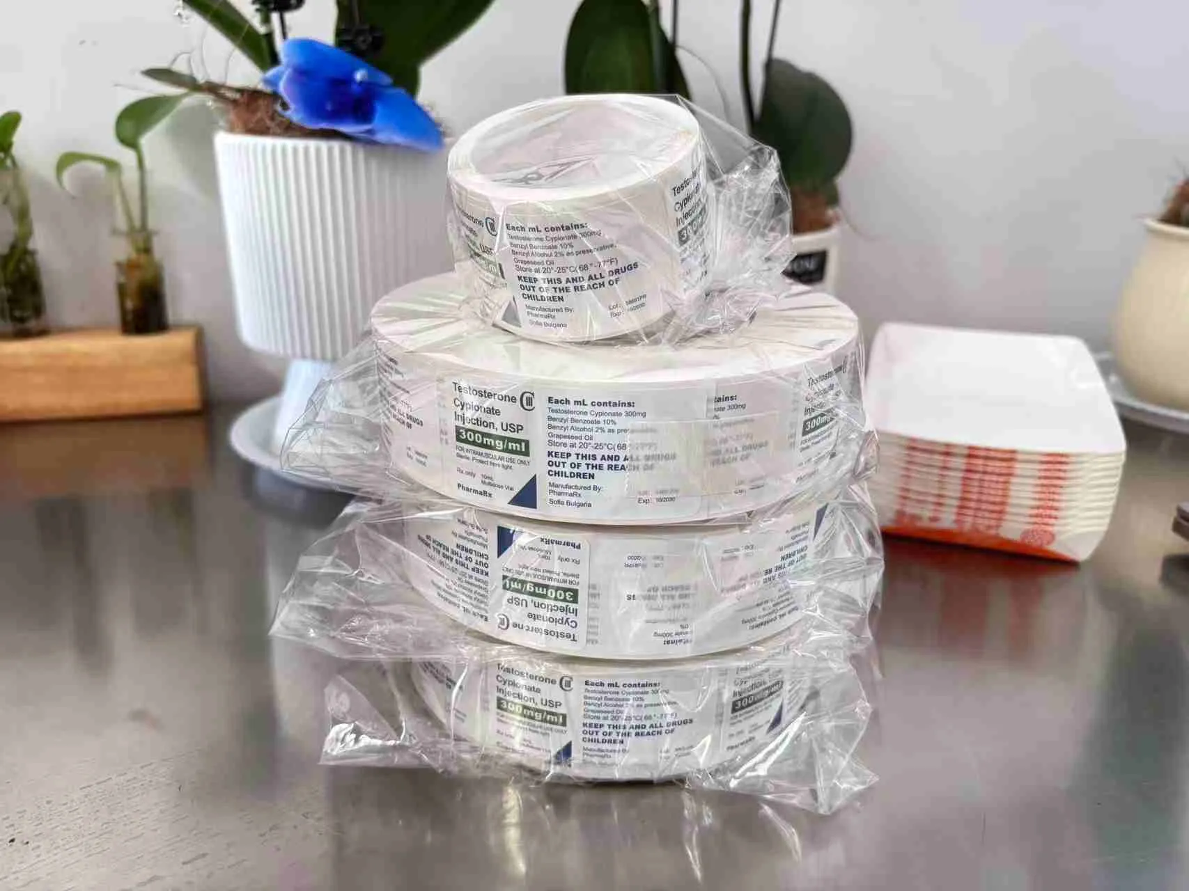 Maidir le hábhair, úsáidimid ábhair PVC ardchaighdeáin. Glacann na lipéid seo ábhair fhéinghreamaitheacha sábháilte agus marthanacha a chomhlíonann riachtanais an tionscail leighis. Tá dea-marthanacht agus friotaíocht uisce acu. Is féidir leo caitheamh agus taise a chosc go héifeachtach, ag cinntiú go bhfanann an fhaisnéis soiléir agus iomlán le linn iompair agus úsáide.
