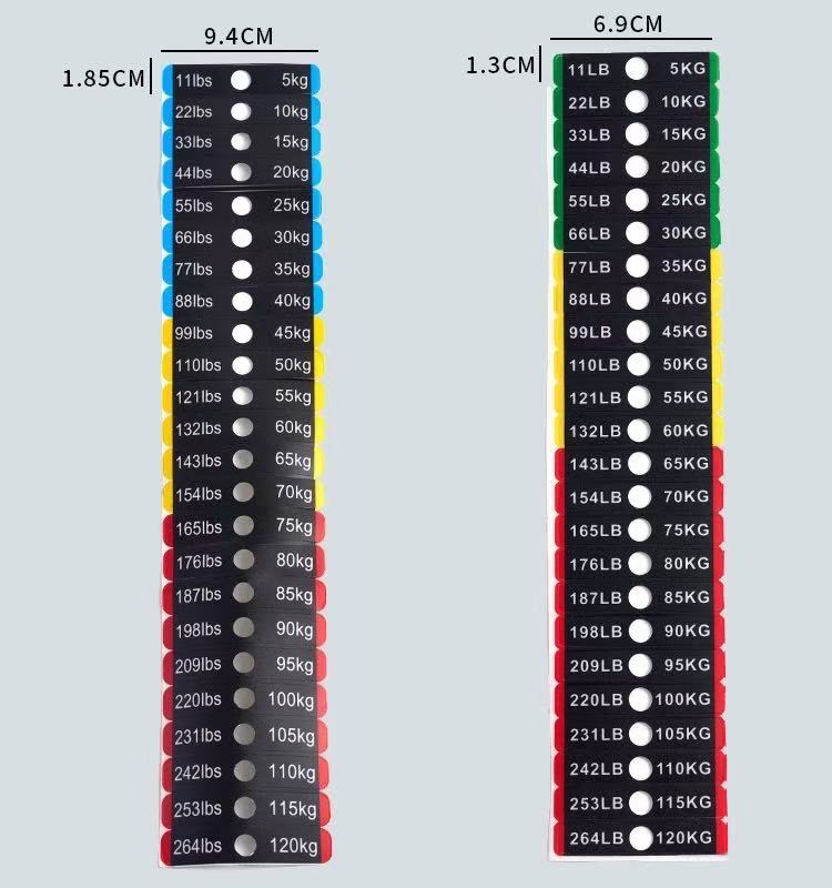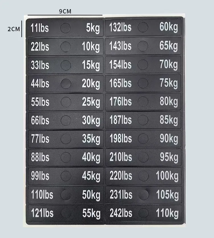 Tá gach greamán marcáilte go soiléir le luachanna meáchain, rud a chuireann ar chumas úsáideoirí bloic meáchain oiriúnach dá déine oiliúna a aithint agus a roghnú go tapa, agus meáchain a sheachaint go minic le linn workouts.