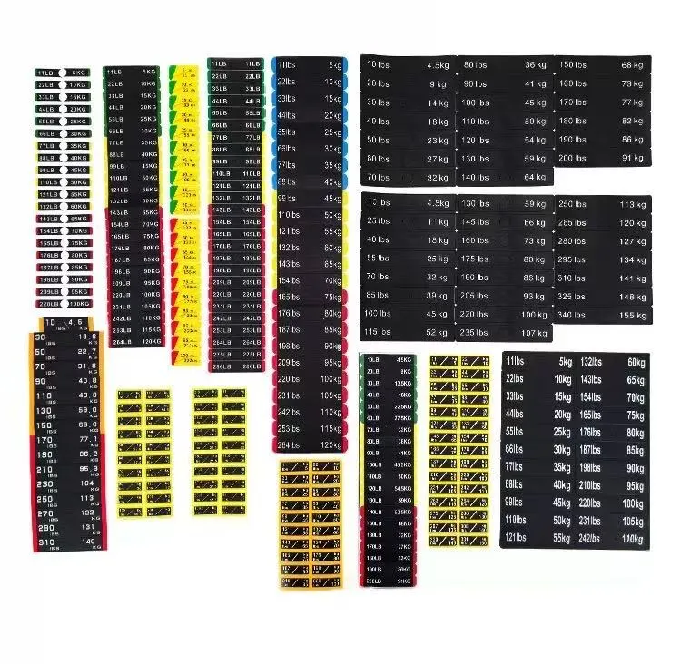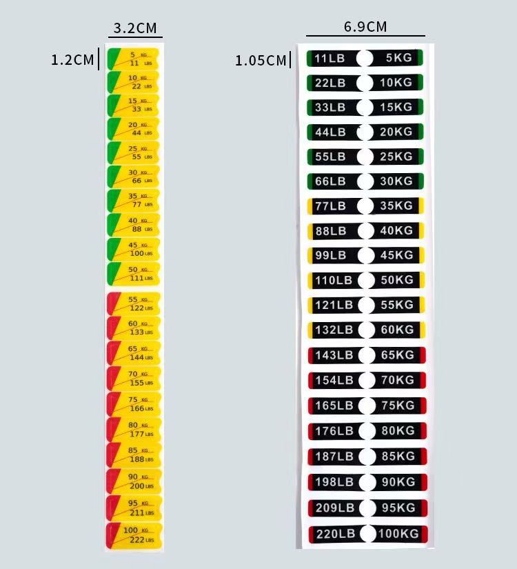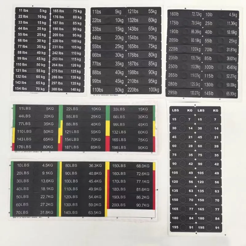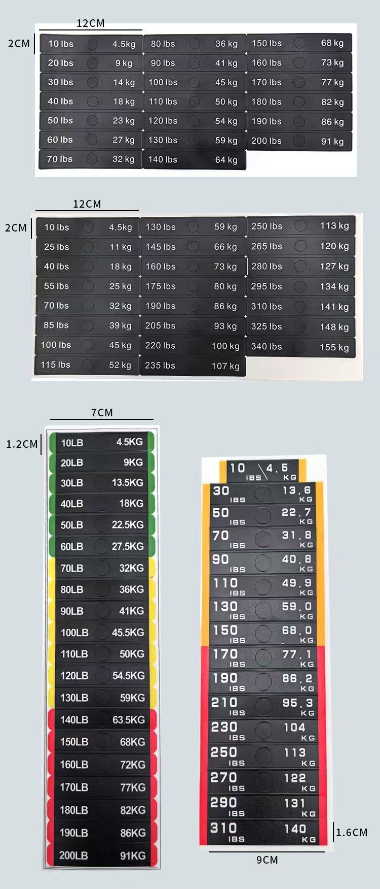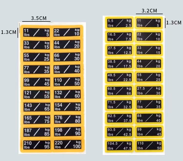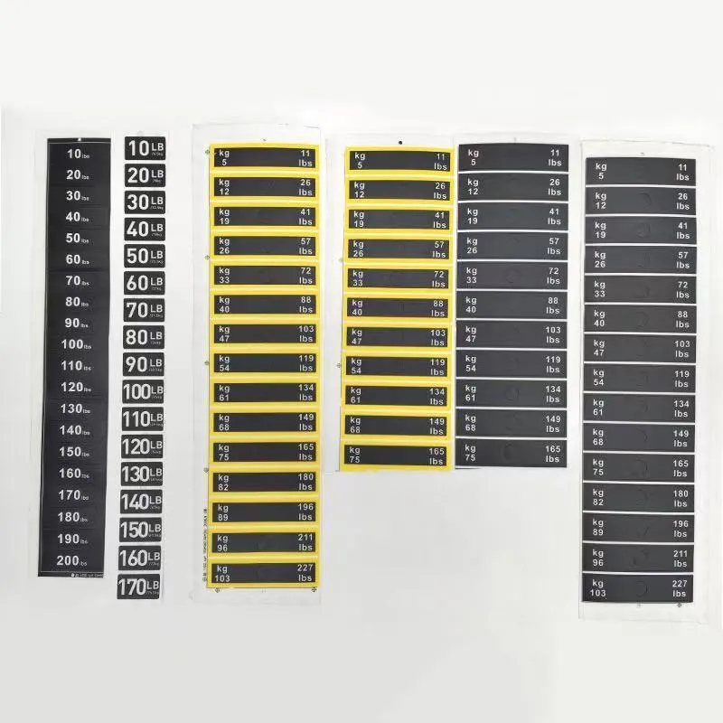 Is cineál greamáin aitheantais iad na greamáin meáchain seo le haghaidh bloic meáchain trealaimh aclaíochta atá saindeartha chun meáchan fearas aclaíochta a lipéadú. De ghnáth déantar iad as ábhar PVC, agus is féidir leat tagairt a dhéanamh don tábla paraiméadar táirge le haghaidh toisí sonracha. Tá na luachanna meáchain marcáilte go soiléir ar na greamáin, rud a ligeann d'úsáideoirí an meáchan oiliúna cuí a aithint agus a roghnú go tapa.