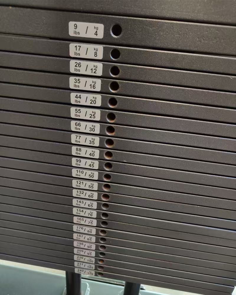 Tá na greamáin seo déanta as ábhair ardchaighdeáin, agus tá siad frithsheasmhach in aghaidh caitheamh agus cuimilt ó úsáid laethúil. Fanann an téacs clóite géar agus céimnithe ar feadh shaol seirbhíse an trealaimh aclaíochta, rud a chinntíonn feidhmíocht fhadtéarmach. Le marcálacha meáchain soiléire, is féidir le húsáideoirí a ndul chun cinn folláine a rianú níos fearr agus spriocanna oiliúna a leagan síos, ag baint amach bainistíocht oiliúna eolaíoch.
